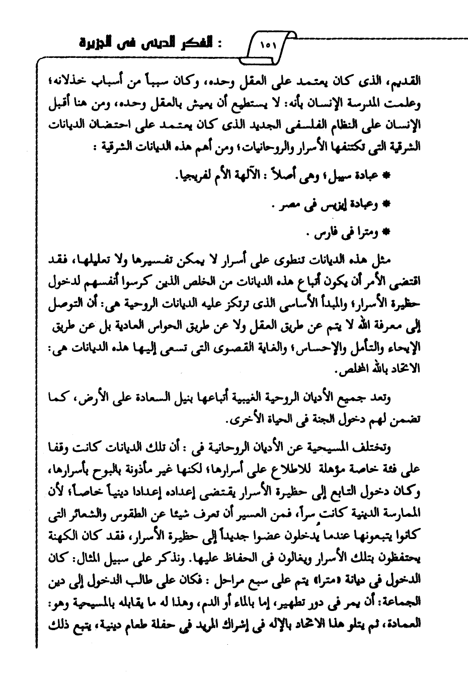 مثل هذه الديانات تنطوي على أسرار لا يمكن تفسيرها ولا تعليلها، فقد اقتضى الأمر أن يكون أتباع هذه الديانات من الخلص الذين كرسوا أنفسهم لدخول حظيرة الأسرار؛ والمبدأ الأساسي الذي ترتكز عليه الديانات الروحية هي: أن التوصل إلى معرفة الله لا يتم عن طريق العقل ولا عن طريق الحواس العادية بل عن طريق الإيحاء والتأمل والإحساس؛ والغاية القصوى التي تسعى إليها هذه الديانات هي: الاتحاد بالله المخلص.