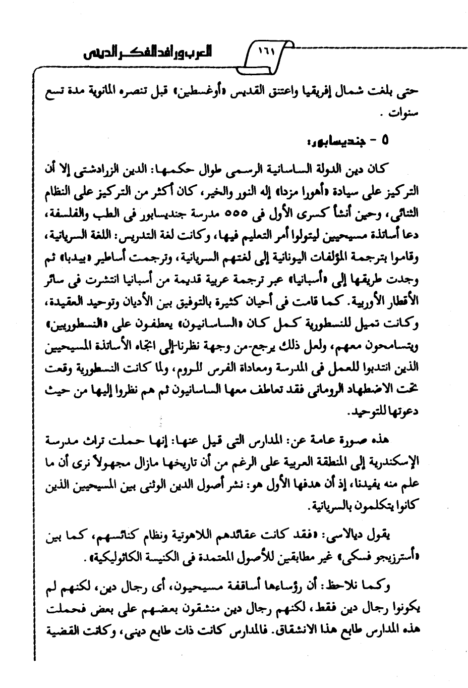 كان دين الدولة الساسانية الرسمي طوال حكمها: الدين الزرداشتي إلا أن التركيز على سيادة "أهورا مزدا" إله النور والخير، كان أكثر من التركيز على النظام الثنائي، وحين أنشأ كسرى الأول في 555 مدرسة جنديسابور في الطب والفلسفة، دعا أساتذة مسيحيين؛ ليتولو أمر التعليم فيها، وكانت لغة التدريس اللغة السريانية، وقاموا بترجمة المؤلفات اليونانية إلى لغتهم السريانية، وترجمت أساطير "بيدبا"، ثم وجدت طريقها إلى "أسبانيا" عبر ترجمة عربية قديمة من أسبانيا انتشرت في سائر الأقطار الأوروبية، كما قامت في أحيان كثيرة بالتوفيق بين الأديان وتوحيد العقيدة، وكانت تميل للنسطورية كمل كان "الساسانيون" يعطفون على "النسطوريين" ويتسامحون معهم، ولعل ذلك يرجع -من وجهة نظرنا- إلى اتجاه الأساتذة المسيحيين الذين انتدبوا للعمل في المدرسة ومعاداة الفرس للروم، ولما كانت النسطورية وقعت تحت الاضطهاد الروماني فقد تعاطف معها الساسانيون، ثم هم نظروا إليها من حيث دعوتها للتوحيد.