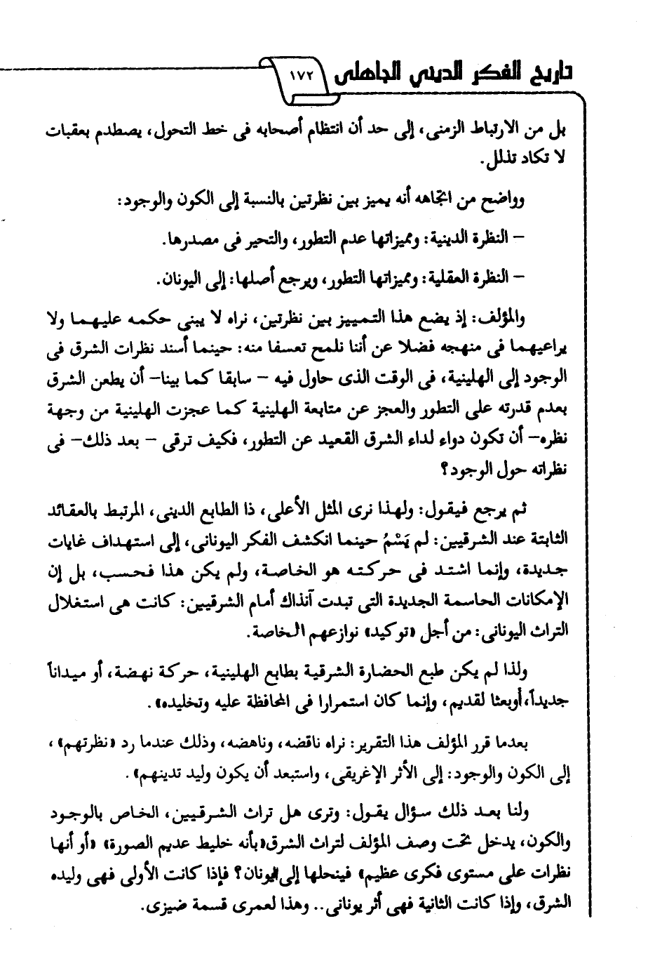 بعدما قرر المؤلف هذا التقرير: نراه ناقضه، وناهضه، وذلك عندما رد "نظرتهم" إلى الكون والوجود إلى الأثر الإغريقي، واستبعد أن يكون وليد تدينهم".