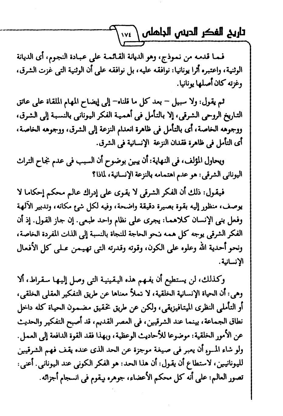 فما قدمه من نموذج، وهو الديانة القائمة على عبادة النجوم؛ أي الديانة الوثنية، واعتبره أثرا يونانيا: نوافقه عليه، بل نوافقه على أن الوثنية التي غزت الشرق، وغزته كان أصلها يونانيا.