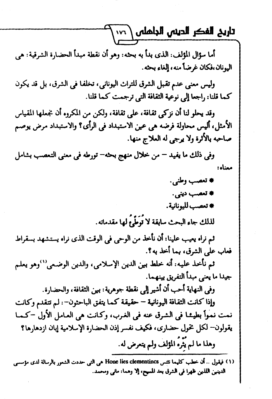 أما سؤال المؤلف الذي بدأ به بحثه: وهو أن نقطة مبدأ الحضارة الشرقية هي اليونان، فكان غرضًا منه إلغاء بحثه.