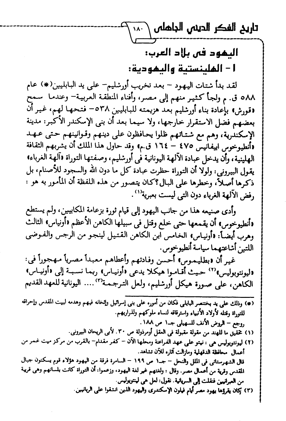 لقد بدأ شتات اليهود -بعد تخريب أورشليم- على يد البابلين1 عام 588 ق. م. ولجأ كثير منهم إلى مصر، وأفناء المنطقة العربية -وعندما سمح "قورش" بإعادة بناء أورشليم بعد هزيمته للبابليين 538 فتحها لهم، غير أن بعضهم فضل الاستقرار خارجها، ولا سيما بعد أن بنى الإسكندر الأكبر: مدينة الإسكندرية، وهم مع شتاتهم ظلوا يحافظون على دينهم وقوانينهم حتى عهد "أنطيوخوس إبيفانيس 475-164 ق. م"، وقد حاول هذا الملك أن يشربهم الثقافة الهلينية، وأن يدخل عبادة الآلهة اليونانية في أورشليم، وصفتها التوراة "آلهة الغرباء"، يقول البيروني: ولولا أن التوراة حظرت عبادة كل ما دون الله والسجود للأصنام، بل ذكرها أصلا، وخطرها على البال؟ كان يتصور من هذه اللفظة أن المأمور به هو: رفض الآلهة الغرباء دون التي ليست بعبرية2.