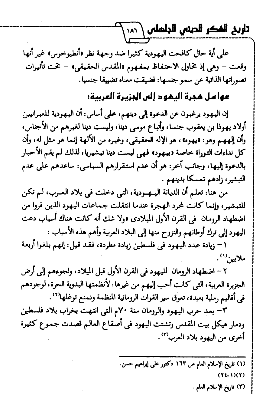 من هنا تعلم أن الديانة اليهودية، التي دخلت في بلاد العرب لم تكن للتبشير، وإنما كانت لمجرد الهجرة عندما انتقلت جماعات اليهود الذين فروا من اضطهاد الرومان في القرن الأول الميلادي "ولا شك أنه كانت هناك أسباب دعت اليهود إلى ترك أوطانهم والنزوح منها إلى البلاد العربية وأهم هذه الأسباب: