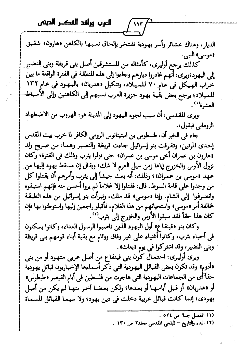 كذلك يرجع أوليرى كأمثاله من المستشرقين أصل بني قريظة وبني النضير إلى اليهود؛ ويرى أنهم غادروا ديارهم وجاءوا إلى هذه المنطقة في الفترة الواقعة ما بين خراب الهيكل في عام 70 للميلاد، وتنكيل "هدريان" باليهود في عام 132 للميلاد؛ يرجع بعض بقية يهود جزيرة العرب نسبهم إلى الكاهنين وإلى الأسباط العشرة1.