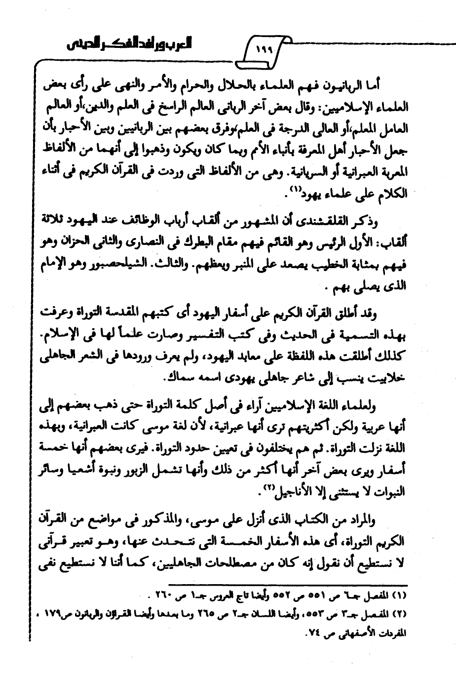 ولعلماء اللغة الإسلاميين آراء في أصل كلمة التوراة حتى ذهب بعضهم إلى أنها عربية، ولكن أكثريتهم ترى أنها عبارنية؛ لأن لغة موسى كانت العبرانية، وبهذه اللغة نزلت التوراة، ثم هم يختلفون في تعيين حدود التوراة، فيرى بعضهم أنها خمسة أسفار ويرى بعض آخر أنها أكثر من ذلك وأنها تشمل الزبور ونبوة أشعيا وسائر النبوات لا يستثنى إلا الأناجيل2.