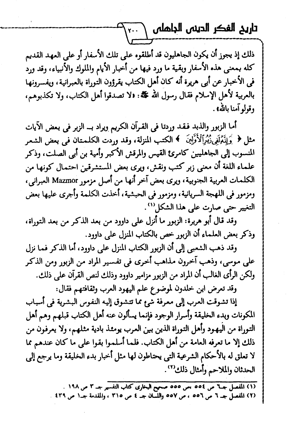 ذلك؛ إذ يجوز أن يكون الجاهليون قد أطلقوه على تلك الأسفار أو على العهد القديم كله بمعنى هذه الأسفار وبقية ما ورد فيها من أخبار الأيام والملوك والأنبياء، وقد ورد في الأخبار عن أبي هريرة أنه كان أهل الكتاب يقرأون التوراة بالعبرانية، ويفسرونها بالعربية لأهل الإسلام، فقال رسول الله صلى الله عليه وسلم: "لا تصدقوا أهل الكتاب، ولا تكذبوهم، وقولوا: آمنا بالله".