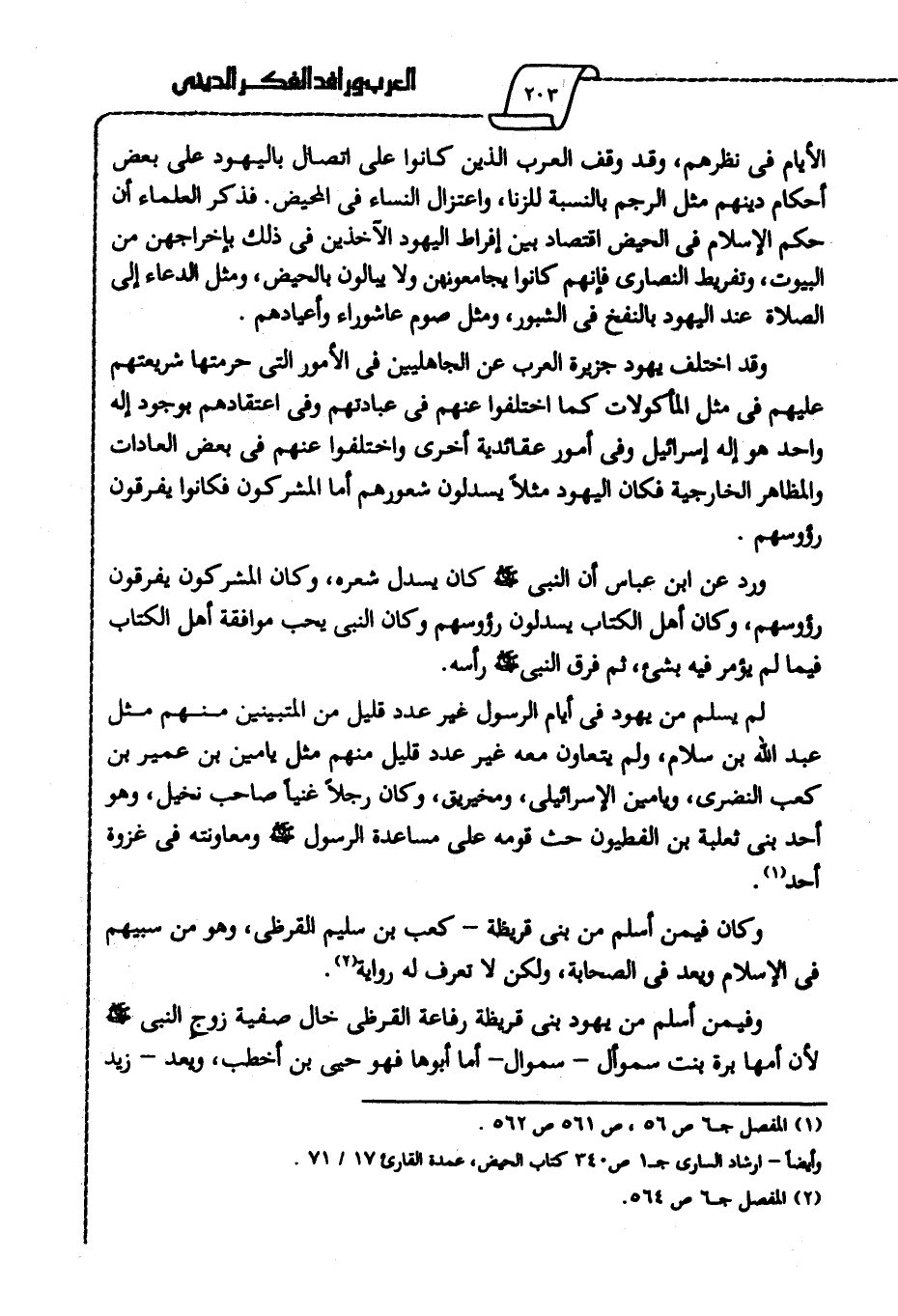 الأيام في نظرهم، وقد وقف العرب الذين كانوا على اتصال باليهود على بعض أحكام دينهم مثل الرجم بالنسبة للزنا، واعتزال النساء في المحيض، فذكر العلماء أن حكم الإسلام في الحيض اقتصاد بين إفراط اليهود الآخذين في ذلك إخراجهن من البيوت، وتفريط النصارى فإنهم كانوا يجامعونهن ولا يبالون بالحيض، ومثل الدعاء إلى الصلاة عند اليهود بالنفخ في الشبور، ومثل صوم عاشوراء وأعيادهم.