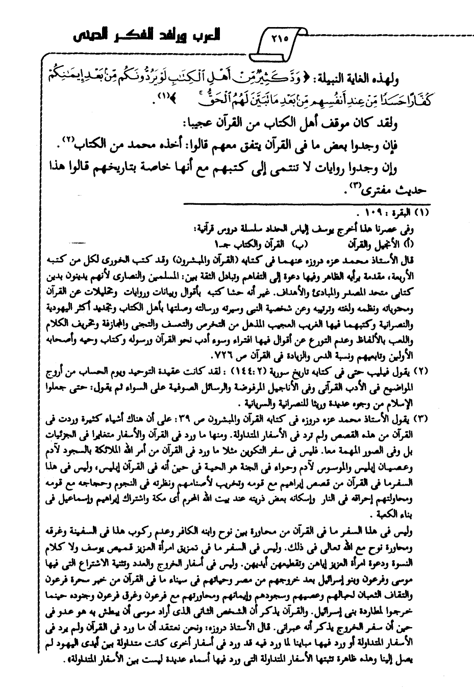 3 يقول الأستاذ محمد عزه دروزه في كتابه القرآن والمبشرون ص39: على أن هناك أشياء كثيرة وردت في القرآن من هذه القصص ولم ترد في الأسفار المتداولة. ومنها ما ورد في القرآن والأسفار متغايرا في الجزئيات بل وفي الصور المهمة معًا، فليس في سفر التكوين مثلًا ما ورد في القرآن من أمر الله الملائكة بالسجود لآدم وعصيان إبليس والموسوس لآدم وحواء في الجنة هو الحية في حين أنه في القرآن إبليس، وليس في هذا السفرما ف يالقرىن من قصص إبراهيم مع قومه وتخريب لأصنامهم ونظرته في النجوم وحجاجه مع قومه ومحاولتهم إحراقه في النار وإسكانه بعض ذريته عند بيت الله المحرم أي مكة واشتراك إبراهيم وإسماعيل في بناء الكعبة.