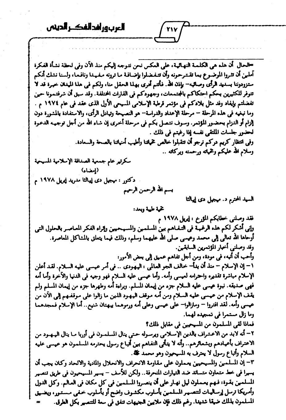 وإني أشكر لكم هذه الرغبة في التفاهم بين المسلمين والمسيحيين وإثراء الفكر المعاصر بالحلول التي أوحاها الله تعالى إلى محمد وعيسى صلى الله عليهما وسلم، وذلك فيما يتعلق بالمشاكل المعاصرة.