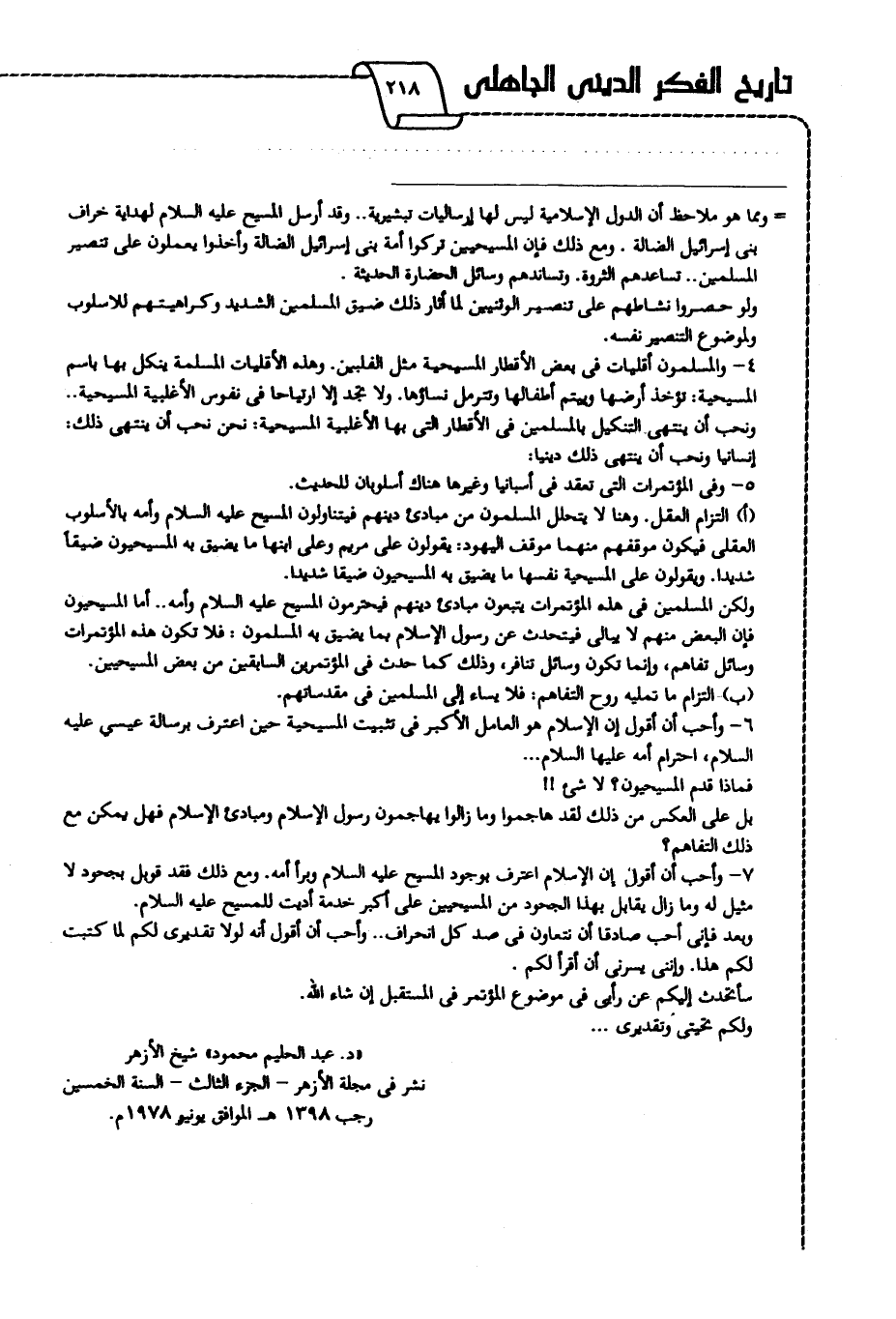 ولكن المسلمين في هذه المؤتمرات يتبعون مبادئ دينهم فيحترمون المسيح عليه السلام وأمه، أما المسيحيون فإن البعض منهم لا يبالي، فيتحدث عن رسول الإسلام بما يضيق به المسلمون، فلا تكون هذه المؤتمرات وسائل تفاهم، وإنما تكون وسائل تنافر، وذلك كما حدث في المؤتمرين السابقين من بعض المسيحيين.