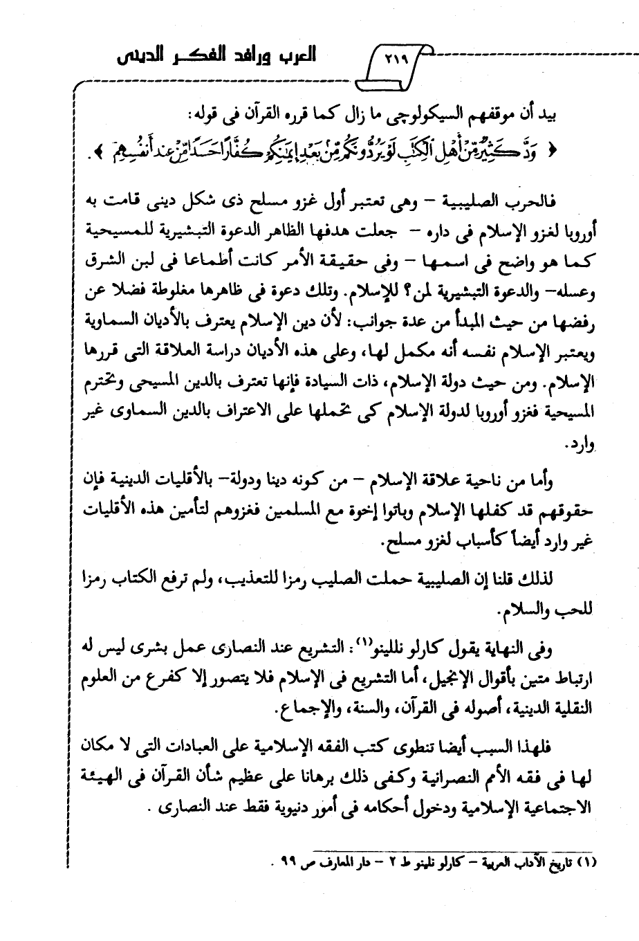 فالحرب الصليبية -وهي تعتبر أول غزو مسلح ذي شكل ديني قامت به أوروبا لغزو الإسلام في داره- جعلت هدفها الظاهر الدعوة التبشيرية للمسيحية كما هو واضح في اسمها -وفي حقيقة الأمر كانت أطماعا في لبن الشرق وعسله- والدعوة التبشيرية لمن؟ للإسلام، وتلك دعوة في ظاهرها مغلوطة فضلًا عن رفضها من حيث المبدأ من عدة جوانب؛ لأن دين الإسلام يعترف بالأديان السماوية ويعتبر الإسلام نفسه أنه مكمل لها، وعلى هذه الأديان دراسة العلاقة التي قررها الإسلام، ومن حيث دولة الإسلام ذات السيادة؛ فإنها تعترف بالدين المسيحي وتحترم المسيحية، فغزو أوروبا لدولة الإسلام كي تحملها على الاعتراف بالدين السماوي غير وارد.