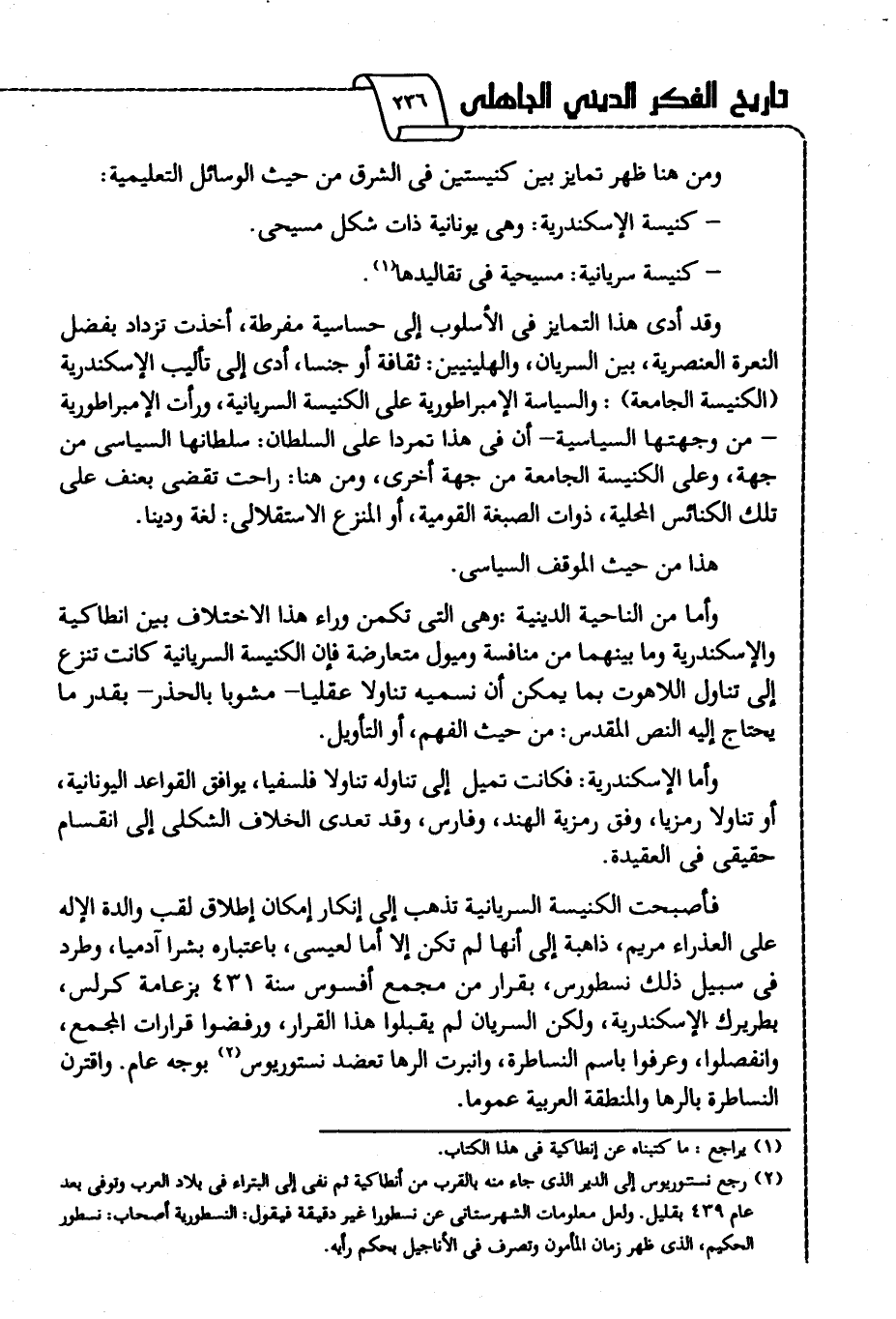 وأما من الناحية الدينية -وهي التي تكمن وراء هذا الاختلاف بين أنطاكية والإسكندرية وما بينهما من منافسة وميول متعارضة- فإن الكنيسة السريانية كانت تنزع إلى تناول اللاهوت بما يمكن أن نسميه تناولا عقليا -مشوبا بالحذر- بقدر ما يحتاج إليه النص المقدس: من حيث الفهم، أو التأويل.
