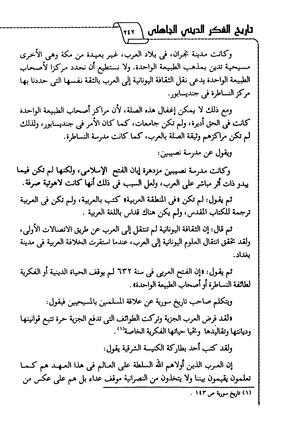 ثم يقول: "إن الفتح العربي في سنة 632 لم يوقف الحياة الدينية أو الفكرية لطائفة النساطرة أو أصحاب الطبيعية الواحدة".