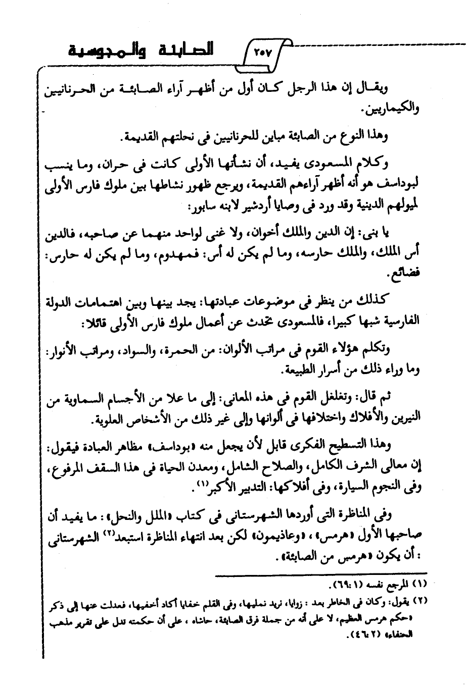 2 يقول: وكان في الخاطر بعد: زوايان نريد نمليهان وفي القلم خفايا أكاد أخفيها، فعدلت عنها إلى ذكر "حكم هرمس العظيمن لا على أنه من جمبلة فرق الصابة، حاشاه، على أن حكمته تدل على تقرير مذهب الحنفاء" "2: 46".