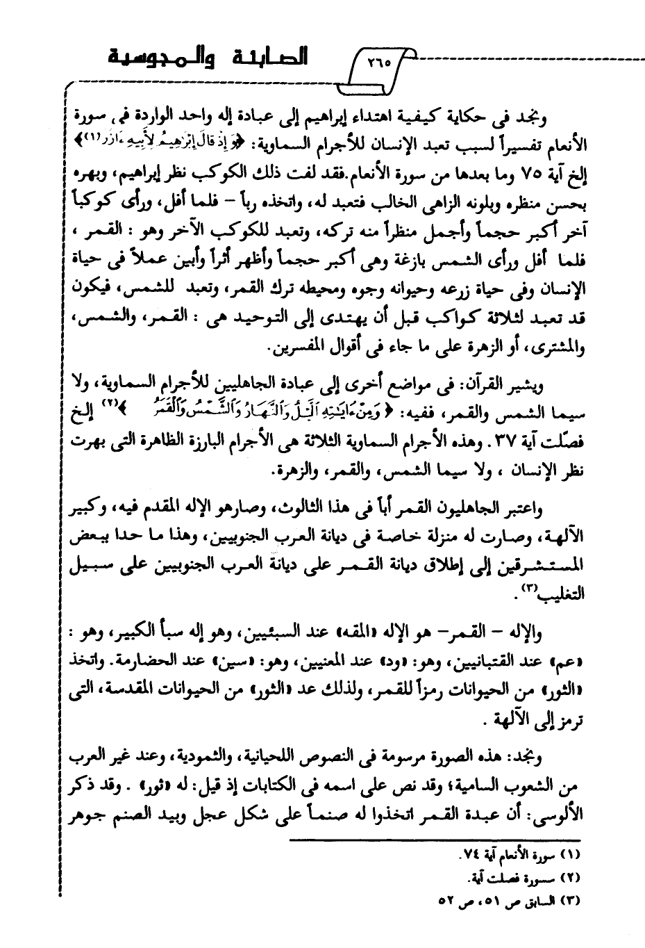 ويشير القرآن: في مواضع أخرى إلى عبادة الجاهلين للأجرام السماوية، ولا سيما الشمس والقمر، ففيه: {وَمِنْ آيَاتِهِ اللَّيْلُ وَالنَّهَارُ وَالشَّمْسُ وَالْقَمَرُ} 2 ... إلخ.