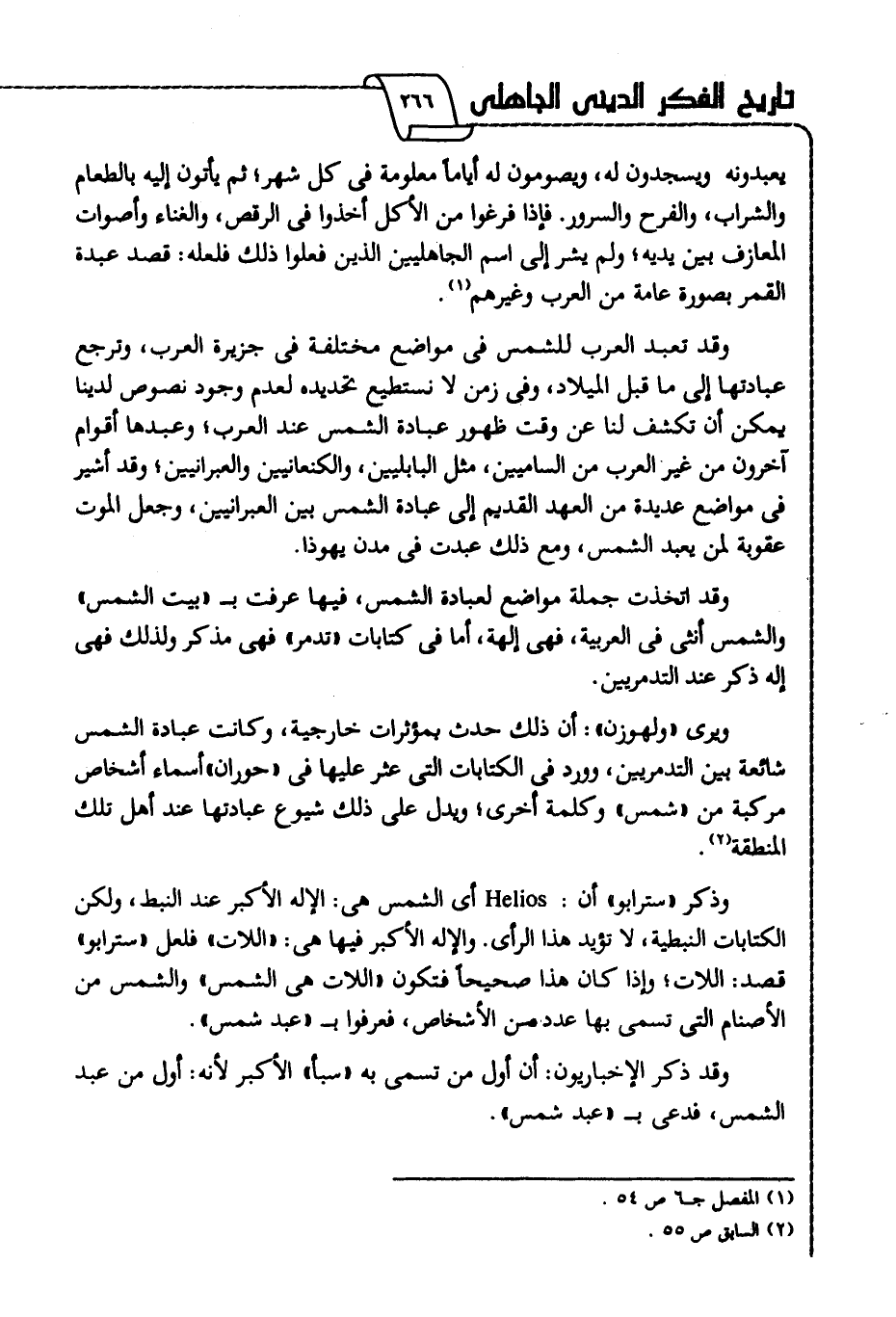 يعبدونه ويسجدون له، ويصومون له أياما معلومة في كل شهر؛ ثم يأتون إليه بالطعام والشراب، والفرح والسرور، فإذا فرغوا من الأكل أخذوا في الرقص، والغناء، وأصوات المعازف بين يديه؛ ولم يشر إلى اسم الجاهليين الذين فعلوا ذلك فعلَّه قصد عبدة القمر بصورة عامة من العرب وغيرهم1.