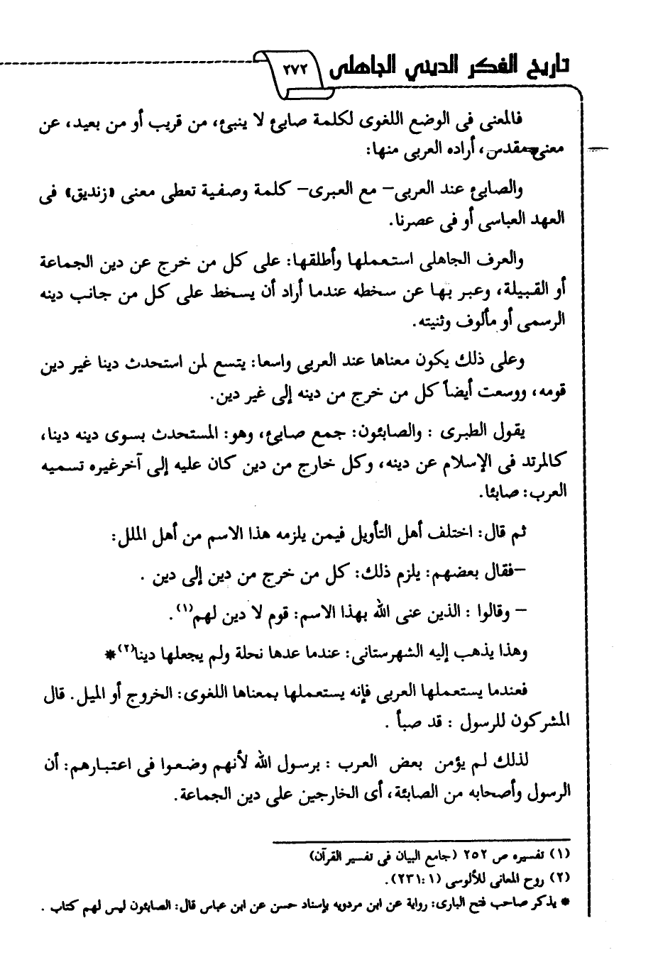 يقول الطبري: والصابئون جمع صابئ، وهو: المستحدث بسوى دينه دينا، كالمرتد في الإسلام عن دينه، وكل خارج من دين كان عليه إلى آخر غيره تسميه العرب: صابئا.