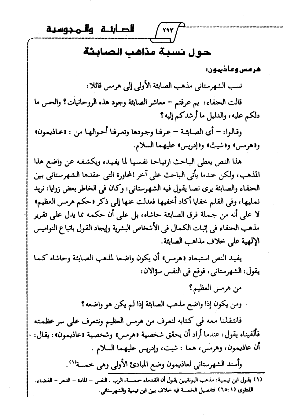 يفيد النص استبعاد "هرمس" أن يكون واضعا لمذهب الصابئة وحاشاه كما يقول: الشهرتاني، فوقع في النفس سؤالان: