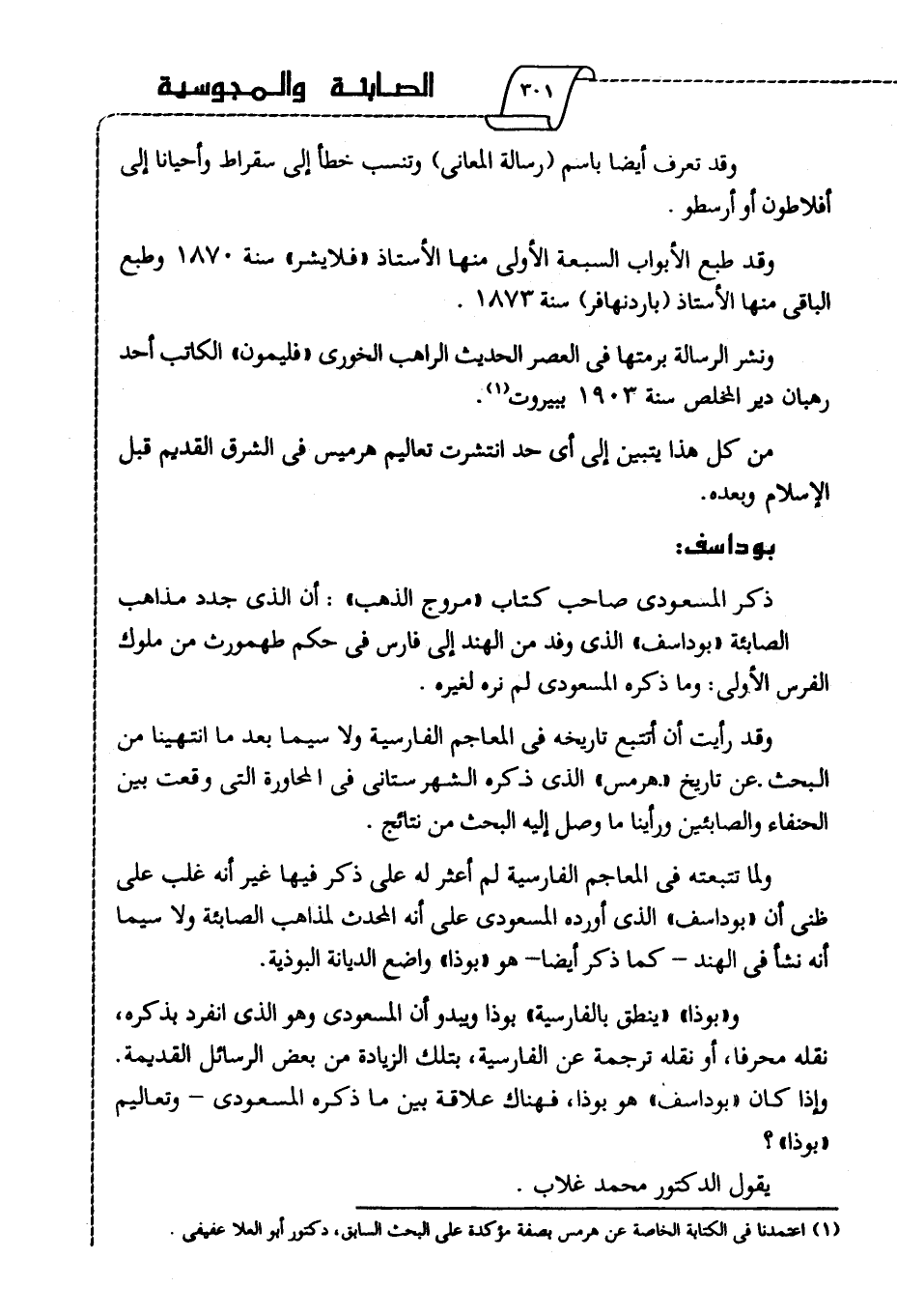 ولما تتبعته في المعاجم الفارسية لم أعثر له على ذكر فيها غير أنه غلب على ظني أن "بوداسف" الذي أورده المسعودي على أنه المحدث لمذاهب الصابئة ولا سيما أنه نشأ في الهند -كما ذكر أيضا- هو "بوذا" واضع الديانة البوذية.