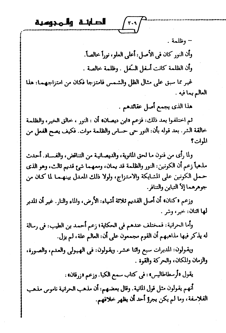 يقول "أرسطاطاليس": في كتاب سمع الكبا. وزعم "زرقان" أنهم يقولون مثل قول المانية، وقال بعضهم: إن مذهب الحرانية ناموس مذهب الفلاسفة، وما لم يكن يجرؤ أحد أن يظهر خلافهم.