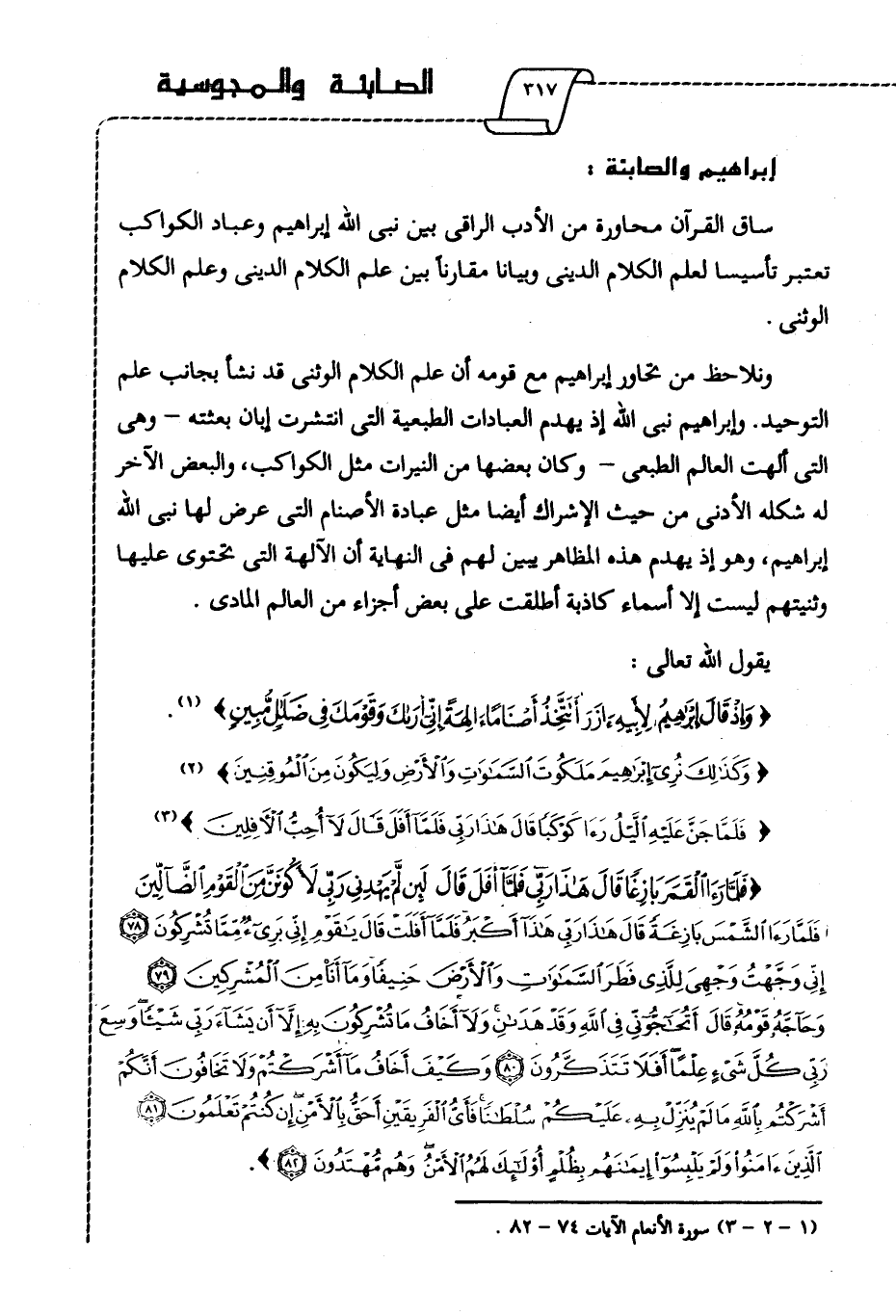 ساق القرآن محاورة من الأدب الراقي بين نبي الله إبراهيم وعباد الكواكب تعتبر تأسيسًا لعلم الكلام الديني مقارنا بين علم الكلام الديني وعلم الكلام الوثني.