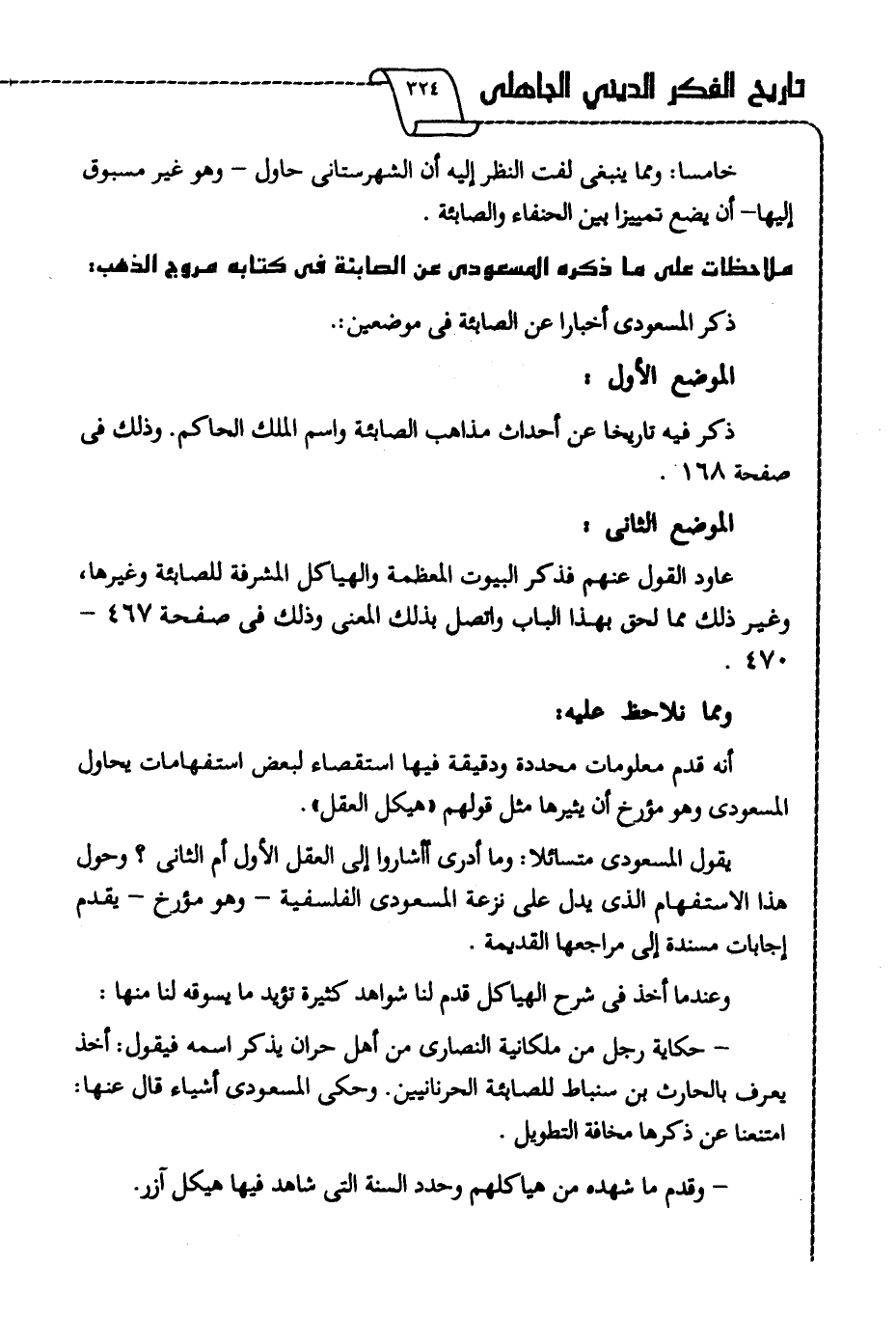 عاود القول عنهم فذكر البيوت المعظمة والهياكل المشرفة للصابئة وغيرها، وغير ذلك مما لحق بهذا الباب واتصل بذلك المعنى، وذلك في صفحة 467-470,