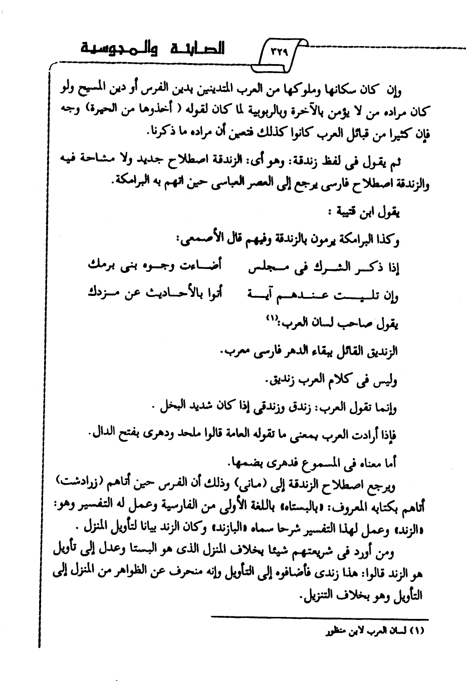 ثم يقول في لفظ زندقة: وهو أى: الزندقة اصطلاح جديد ولا مشاحة فيه والزندقة اصطلاح فارسي يرجع إلى العصر العباسي حين اتهم به البرامكة.