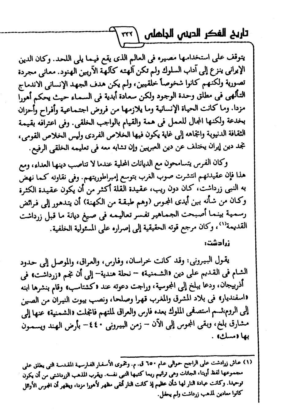 1 عاش زرادشت على الراجح حوالي عام 650 ق. م. وتحتوي الأسفار الفارسية المقدسة التي يطلق على مجموعها لفظ أوبتا، وهي ترانيم ربما كتبها النبى نفسه، ويقرب المذهب الزرداشتي من أن يكون توحيدا، وكانت عبادة النار لها شأن عظيم؛ إذ كانت النار أنقي مظهر لأهورا مزدا، ويظهر أن المجوس الأوائل كانوا معادين لمذهب زرداشت ولم يحفل.