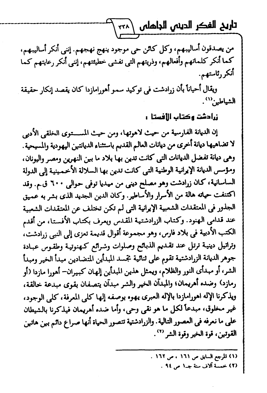 وهي ديانة تفضل الديانات التي كانت تدين بها بلاد ما بين النهرين ومصر واليونان، ومؤسس الديانة الإيرانية الوطنية التي كانت تدين بها السلالة الأخمينية إلى الدولة الساسانية، كان زرادشت وهو مصلح ديني من ميديا توفى حوالى600 ق. م. وقد اكتنفت حياته هالة من الأسرار والأساطير. وكان الدين الجديد الذي بشر به عميق الجذور في المعتقدات الشعبية الإيرانية التي لم تكن تختلف عن المعتقدات الشعبية عند قدامى الهنود. وكتاب الزرادشتية المقدس ويعرف بكتاب الأفستا، من أقدم الكتب الأدبية في بلاد فارس، وهو مجموعة أقوال قديمة تعزى إلى النبي زرادشت، وتراتيل دينية ترتل عند تقديم الذبائح وصلوات وشرائع كهنوتية وطقوس عبادة جوهر الديانة الزرادشتية تقوم على ثنائية تجسد المبدأين المتضادين مبدأ الخير ومبدأ الشر، أو مبدأي النور والظلام، ويمثل هذين المبدأين إلهان كبيران -أهورا مازدا "أو رمازد" وضده أهريمان؛ والمبدآن الخير والشر مبدآن يتصفان بقوى مبدعة خالقة، ويذكرنا الإله أهورامازدا بالإله العبري يهوه بوصفه إلها كلي المعرفة، كلي الوجود، غير مخلوق، مبدعا لكل ما هو نقي وحي، وأما ضد أهريمان فيذكرنا بالشيطان على ما نعرفه في العصور التالية. والزرادشتية تتصور الحياة أنها صراع دائم بين هاتين القوتين، قوة الخير وقوة الشر1.
