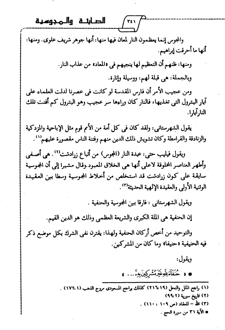 ويقول الشهرستاني فارقا بين المجوسية والحنفية: إن الحنفية هى الملة الكبرى والشريعة العظمى وذلك هو الدين القيم.