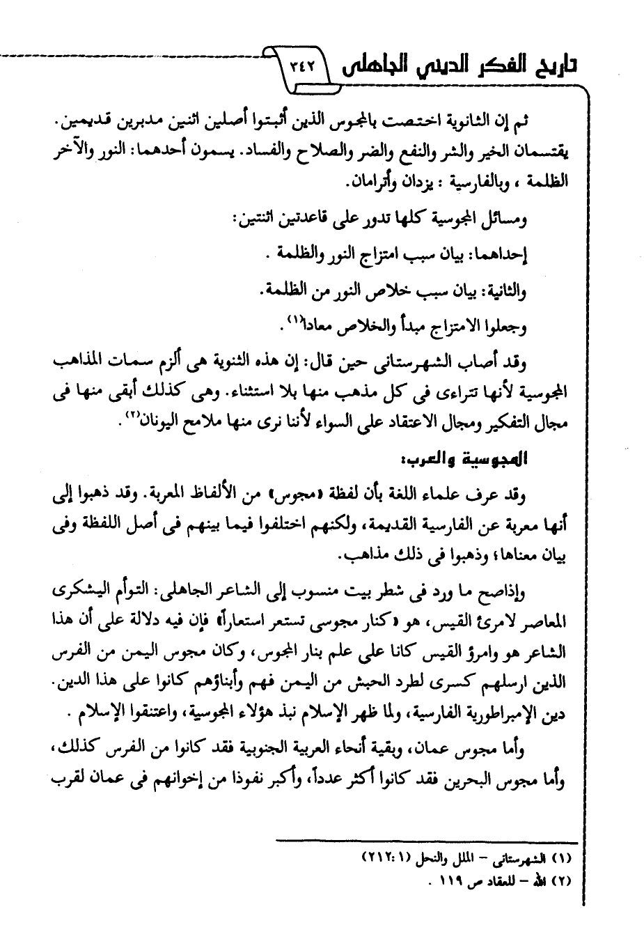وقد أصاب الشهرستاني حين قال: إن هذه الثنوية هي ألزم سمات المذاهب المجوسية؛ لأنها تتراءى في كل مذهب منها بلا استثناء، وهي كذلك أبقى منها في مجال التفكير ومجال الاعتقاد على السواء؛ لأننا نرى منها ملامح اليونان2.