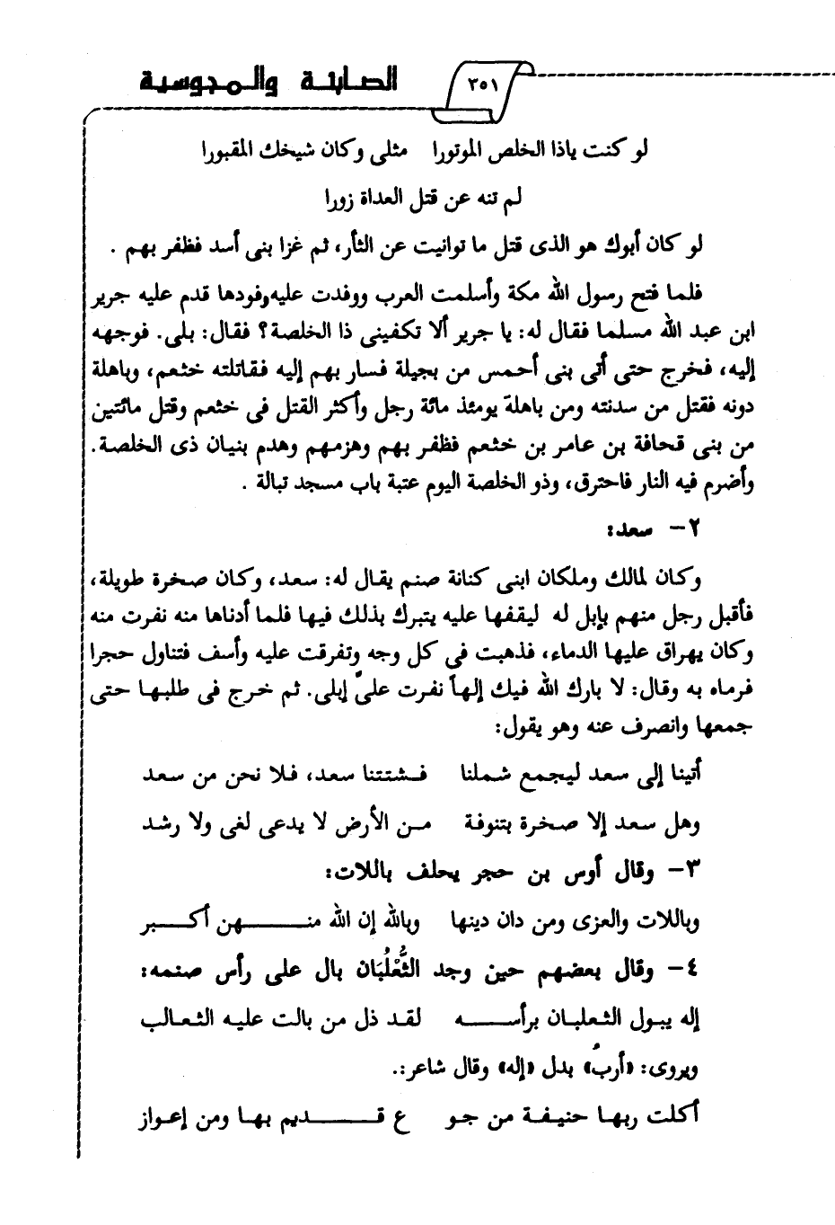 وكان لمالك وملكان ابني كنانة صنم يقال له: سعد، وكان صخرة طويلة، فأقبل رجل منهم بإبل له؛ ليقفها عليه يتبرك فيها، فلما أدناها منه نفرت منه وكان يهراق عليها الدماء، فذهبت في كل وجه وتفرقت عليه وأسف فتناول حجرا فرماه به وقال: لا بارك الله فيك إلها نفرت عليَّ إبلي. ثم خرج في طلبها حتى جمعها وانصرف عنه وهو يقول: