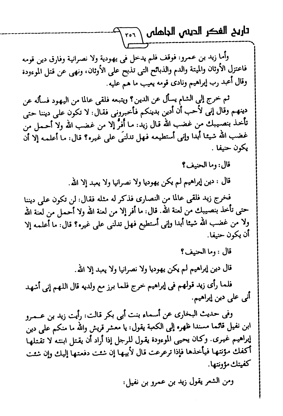 ثم خرج إلى الشام يسأل عن الدين، ويتبعه فلقي عالما من اليهود فسأله عن دينهم وقال: إني لأحب أن أدين بدينكم فأخبروني فقال: لا تكون على ديننا حتى تأخذ بنصيبك من غضب الله، قال زيد: ما أفرُّ إلا من غضب الله ولا أحمل من غضب الله شيئا أبدا وإني أستطيعه فهل تدلنى على غيره؟ قال: ما أعلمه إلا أن يكون حنيفًا. قال: وما الحنيف؟ قال: دين إبراهيم لم يكن يهوديا ولا نصرانيا ولا يعبد إلا الله، فخرج زيد فلقى عالما من النصارى فذكر له مثله، فقال: لن تكون على دين حتى تأخذ بنصيبك من لعنة الله، قال: ما أفر إلا من لعنة الله ولا أحمل من لعنة الله ولا من غضب الله شيئا أبدا وإني أستطيع فهل تدلنى على غيره؟ قال: ما أعلمه أن يكون حنيفا. قال: وما الحنيف؟ قال: دين إبراهيم لم يكن يهوديا ولا نصرانيا ولا يعبد إلا الله.