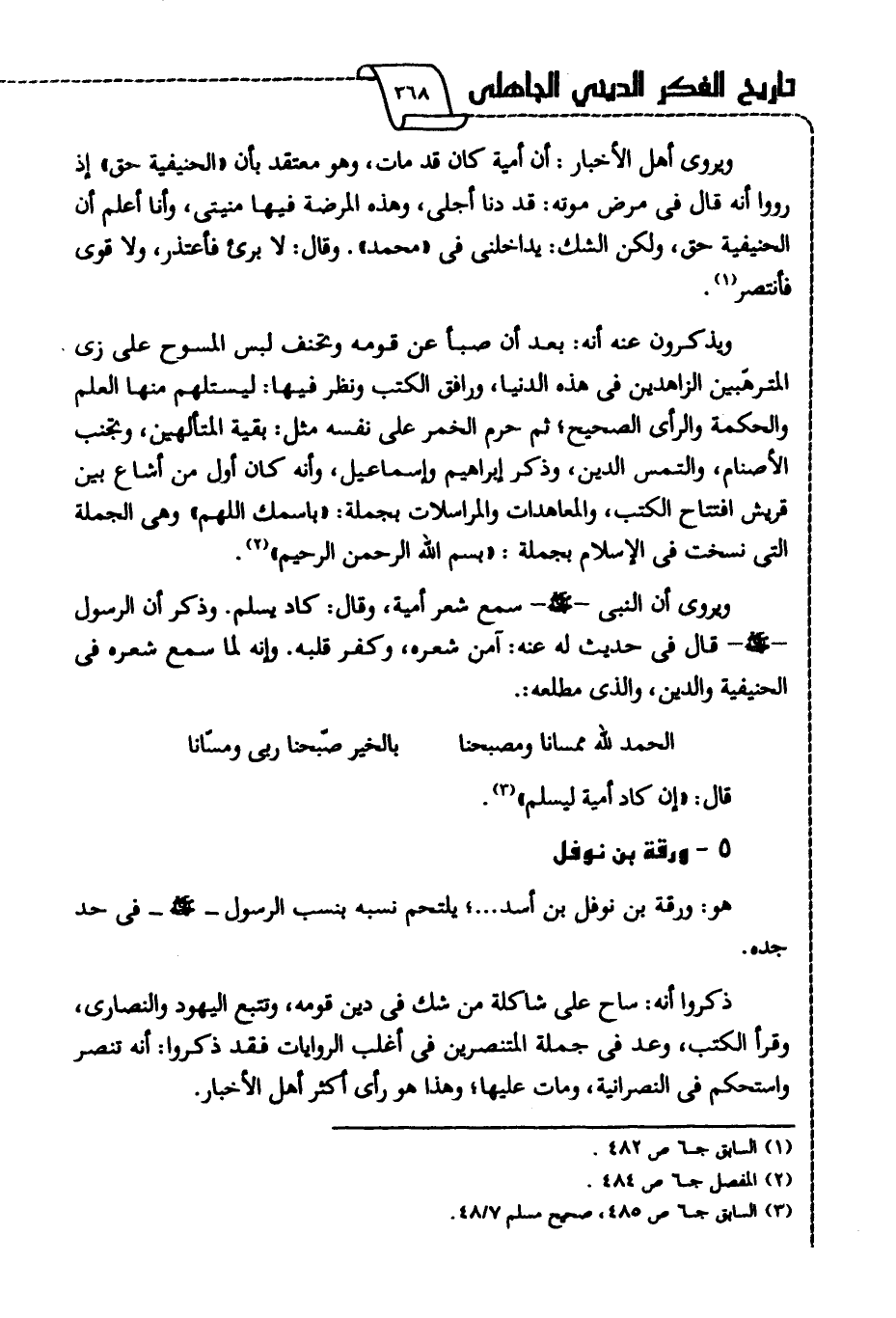 ويذكرون عنه أنه: بعد أن صبأ عن قومه وتحنف لبس المسموح على زي المترهبين الزاهدين في هذه الدنيا، ورافق الكتب ونظر فيها؛ ليستلهم منها العلم والحكمة والرأي الصحيح؛ ثم حرم الخمر على نفسه مثل: بقية المتألهين، وتجنب الأصنام، والتمس الدين، وذكر إبراهيم وإسماعيل، وأنه كان أول من أشاع بين قريش افتتاح الكتب، والمعاهدات والمراسلات بجملة: "باسمك اللهم"، وهي الجملة التي نسخت في الإسلام بجملة: "بسم الله الرحمن الرحيم"2.
