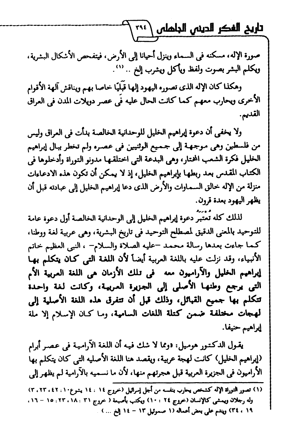 لذلك كله تعتبر دعوة إبراهيم الخليل إلى الوحدانية الخالصة أول دعوة عامة للتوحيد بالمعنى الدقيق لمصطلح التوحيد في تاريخ البشرية، وهي عربية لغة ووطنا، كما جاءت بعدها رسالة محمد -عليه الصلاة والسلام- النبي العظيم خاتم الأنبياء، وقد نزلت عليه باللغة العربية أيضا؛ لأن اللغة التي كان يتكلم بها إبراهيم الخليل والآراميون معه في تلك الأزمان هي اللغة العربية الأم التي يرجع وطنها الأصلى إلى الجزيرة العربية، وكانت لغة واحدة تتكلم بها جميع القبائل، وذلك قبل أن تتفرق هذه اللغة الأصلية إلى لهجات مختلفة ضمن كتلة اللغات السامية، وما كان الإسلام إلا ملة إبراهيم حنيفًَا.