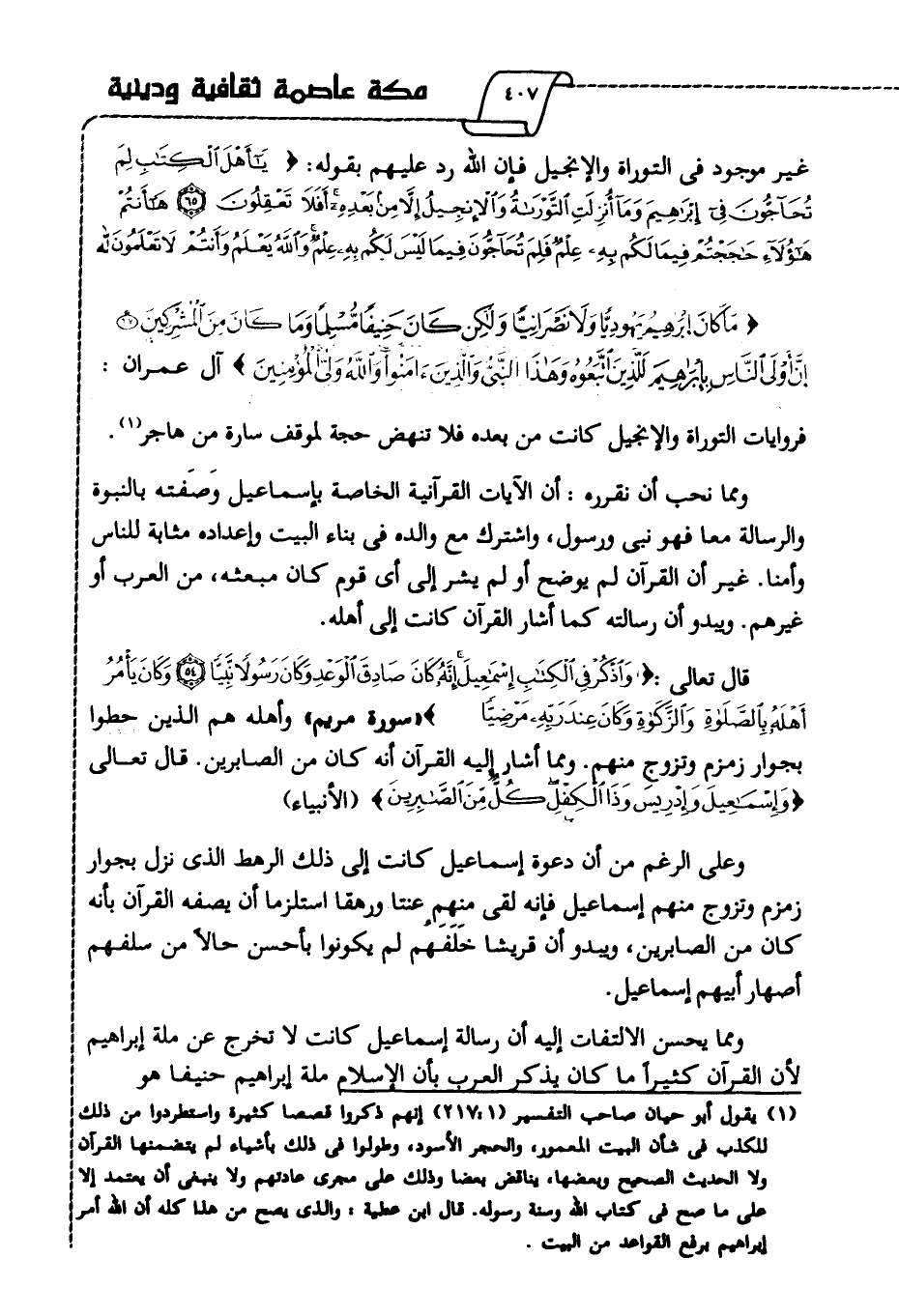 ومما يحسن الالتفات إليه أن رسالة إسماعيل كانت لا تخرج عن ملة إبراهيم؛ لأن القرآن كثيرا ما كان يذكر العرب بأن الإسلام ملة إبراهيم حنيفا هو