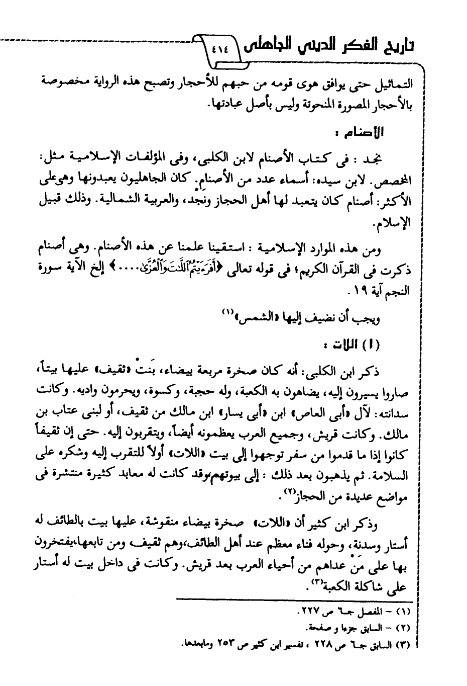ومن هذه الموارد الإسلامية: استقينا علمنا عن هذه الأصنام، وهي أصنام ذكرت في القرآن الكريم؛ في قوله تعالى: {أَفَرَأَيْتُمُ اللَّاتَ وَالْعُزَّى} .. إلخ الآية [النجم: 19] .