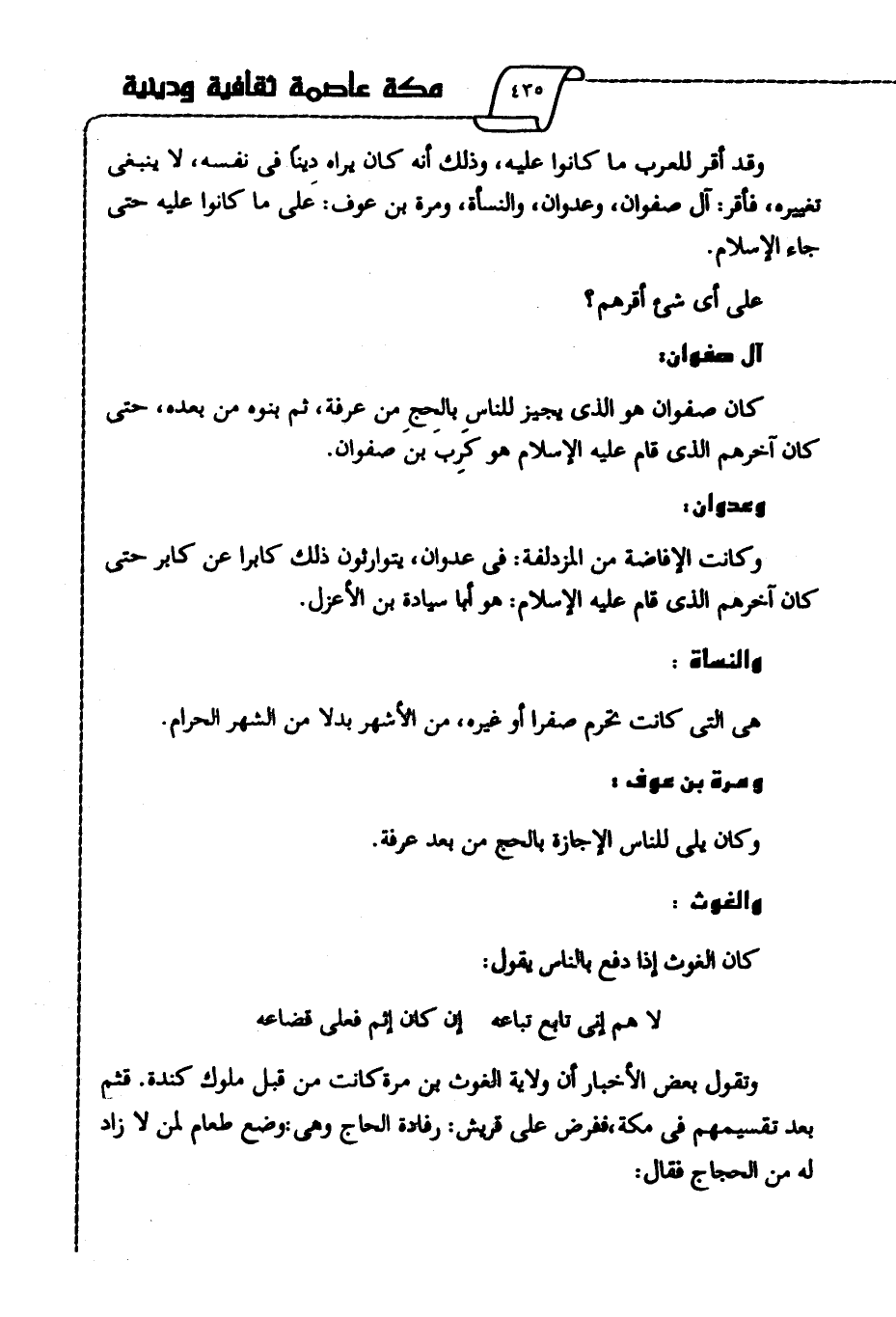 وقد أقر للعرب ما كانوا عليه، وذلك أنه كان يراه دينا في نفسه، لا ينبغي تغييره، فأقر: آل صفوان، وعدوان، والنسأة، ومرة بن عوف على ما كانوا عليه حتى جاء الإسلام.