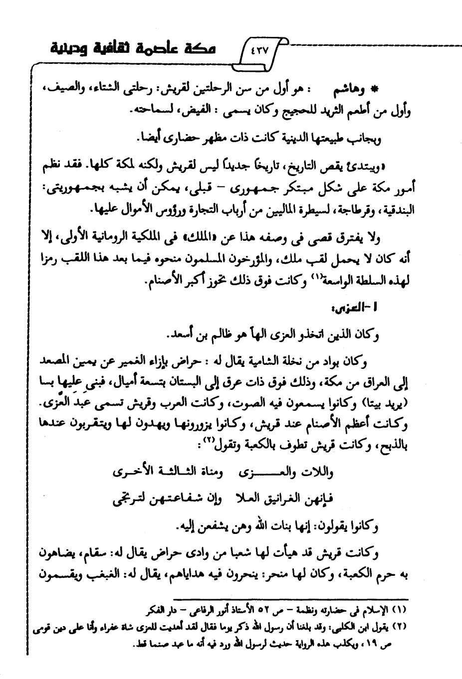 2 يقول ابن الكلبي: وقد بلغنا أن رسول الله ذكر يوما فقال: لقد أهديت للعزى شاة عفراء وأنا على دين قومي ص19، ويكذب هذه الرواية حديث لرسول الله ورد فيه أنه ما عبد صنما قط.
