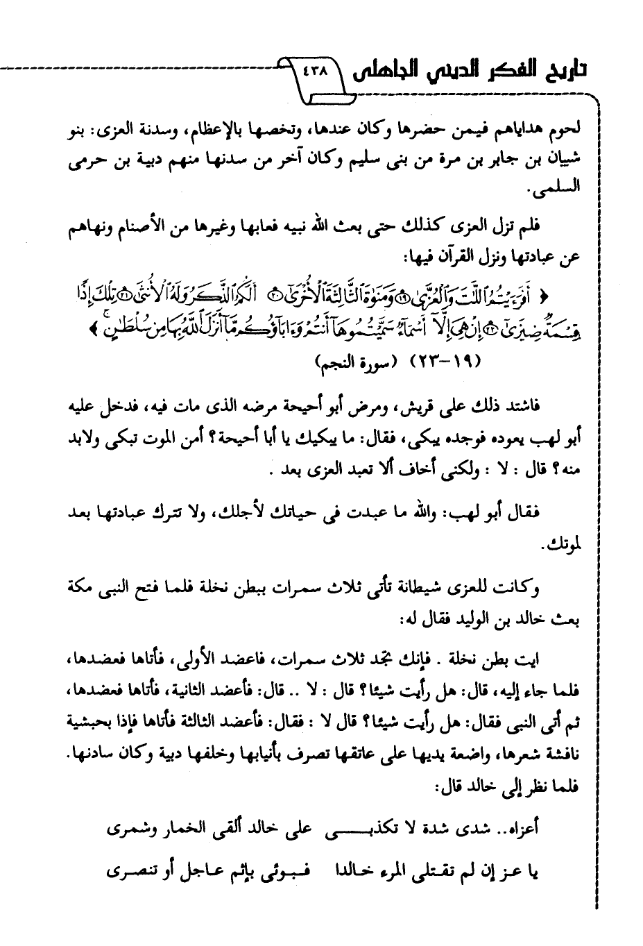 فلم تزل العزى كذلك حتى بعث الله نبيه فعابها وغيرها من الأصنام ونهاهم عن عبادتها ونزل القرآن فيها: {أَفَرَأَيْتُمُ اللَّاتَ وَالْعُزَّى، وَمَنَاةَ الثَّالِثَةَ الْأُخْرَى، أَلَكُمُ الذَّكَرُ وَلَهُ الْأُنْثَى، تِلْكَ إِذًا قِسْمَةٌ ضِيزَى، إِنْ هِيَ إِلَّا أَسْمَاءٌ سَمَّيْتُمُوهَا أَنْتُمْ وَآبَاؤُكُمْ مَا أَنْزَلَ اللَّهُ بِهَا مِنْ سُلْطَانٍ} [النجم: 19-23] .