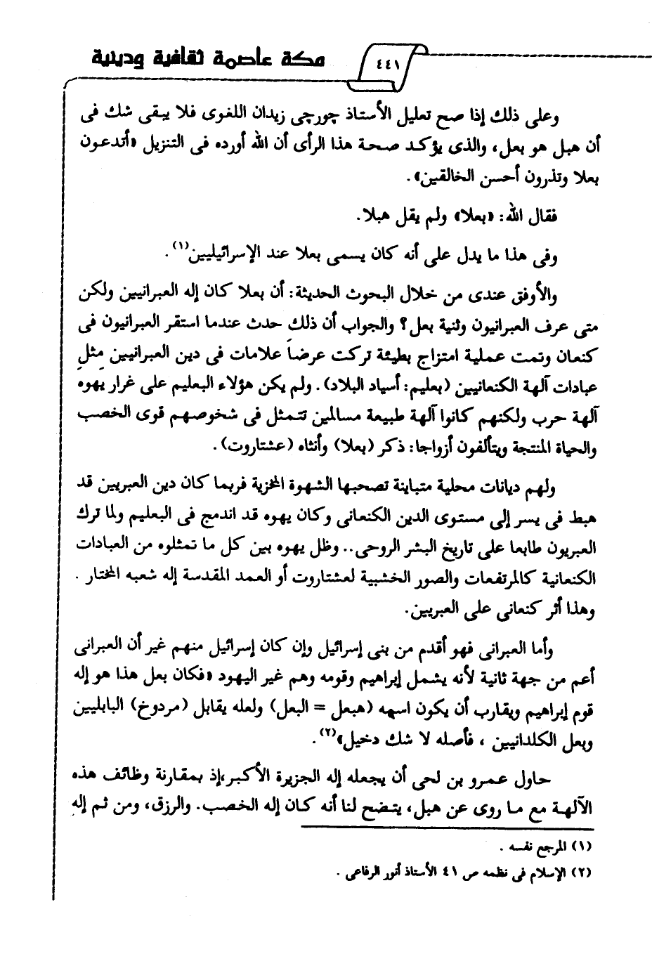 وأما العبراني فهو أقدم من بني إسرائييل وإن كان إسرائيل منهم غير أن العبراني أعم من جهة ثانية؛ لأنه يشمل إبراهيم وقومه وهم غير اليهود، فكان بعل هذا هو إله قوم إبراهيم ويققارب أن يكون اسمه "هبعل البعل" ولعله يقابل "مردوخ" البابليين وبعل الكلدانيين، فأصله لا شك دخيل"2.