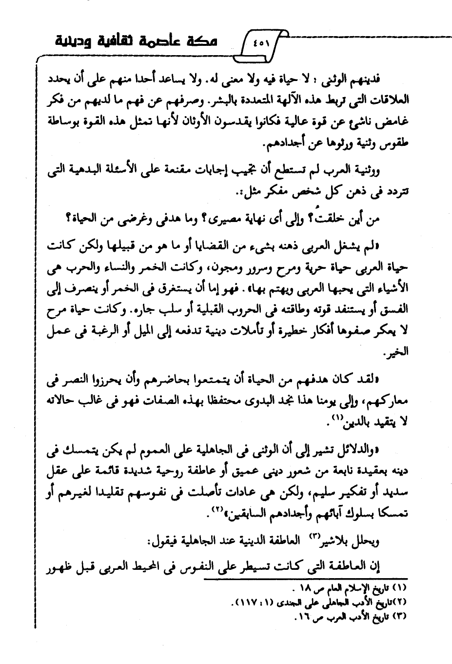 ويحلل بلاشير3 العاطفة الدينية عند الجاهلية فيقول: إن العاطفة التي كانت تسيطر على النفوس في المحيط العربي قبل ظهور