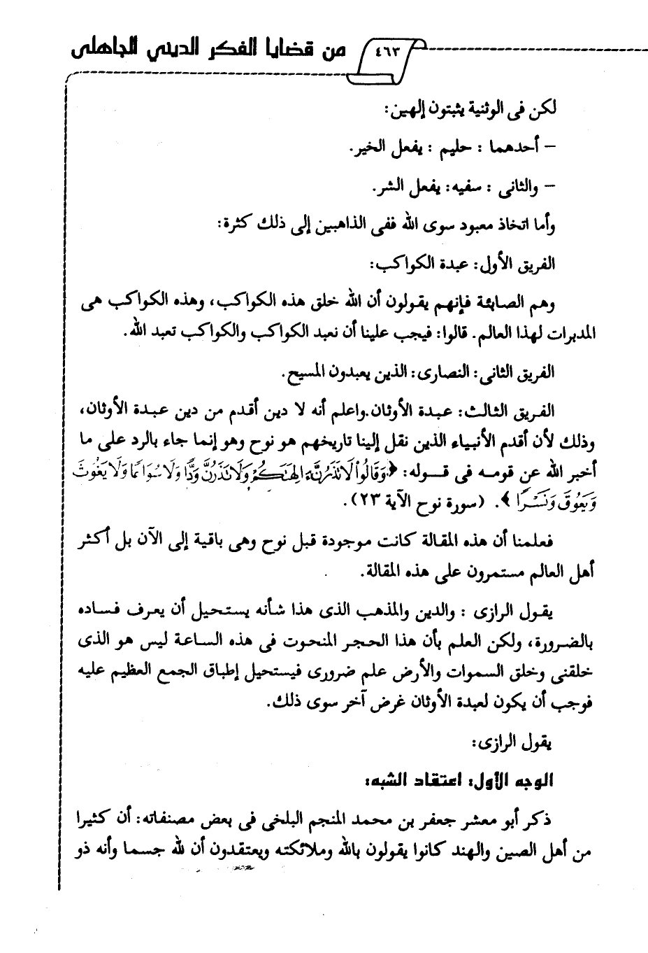 الفريق الثالث: عبدة الأوثان واعلم أنه لا دين أقدم من دين عبدة الأوثان؛ وذلك لأن أقدم الأنبياء الذين نقل إلينا تاريخهم هو نوح وهو إنما جاء بالرد على ما أخبر الله عن قومه في قوله: {وَقَالُوا لا تَذَرُنَّ آلِهَتَكُمْ وَلا تَذَرُنَّ وَدًّا وَلا سُوَاعًا وَلا يَغُوثَ وَيَعُوقَ وَنَسْرًا} [نوح: 23] .