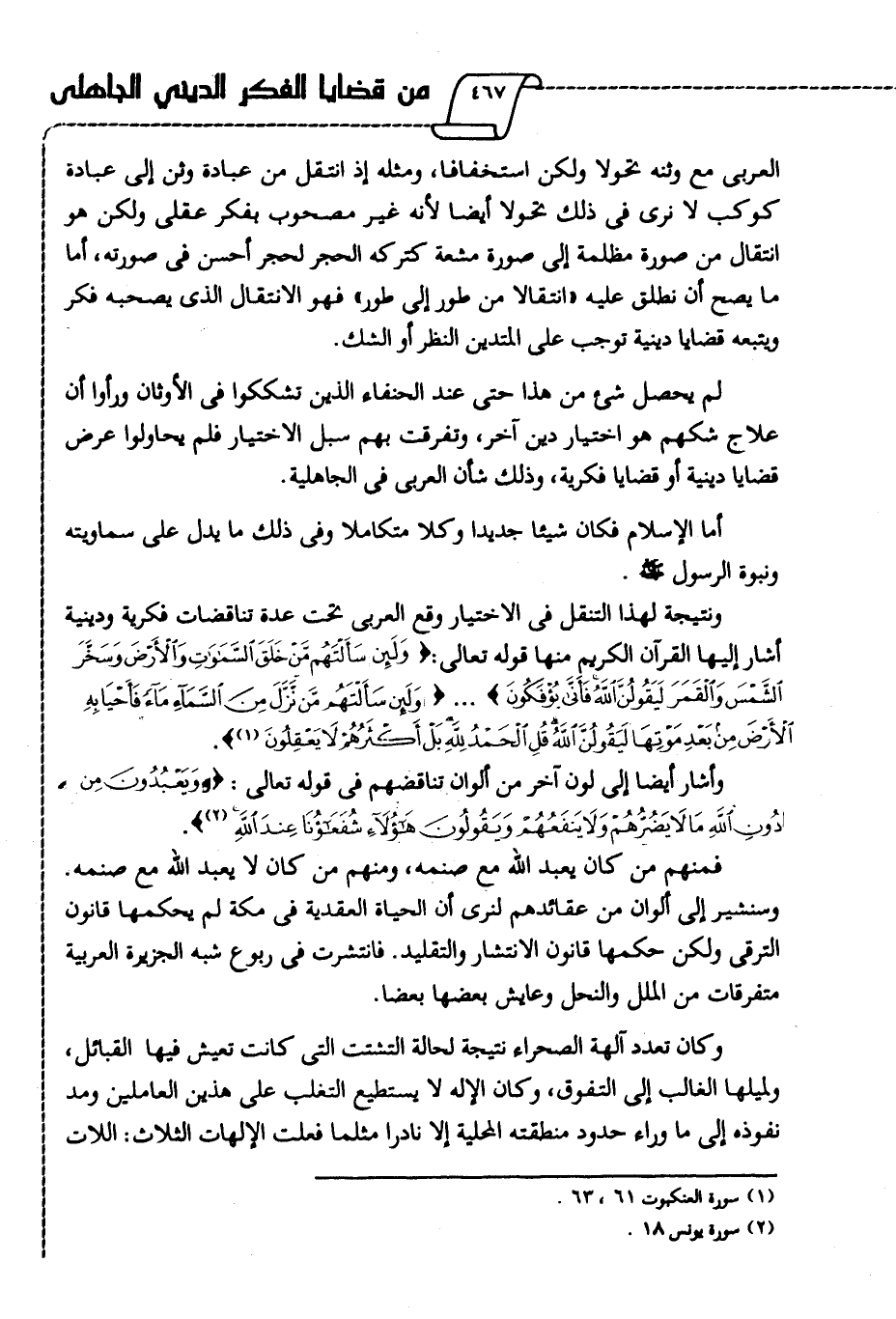 العربي مع وثنه تحولا ولكن استخفافا، ومثله إذ انتقل من عبادة وثن إلى عبادة كوكب لا نرى في ذلك تحولا أيضا لأنه غير مصحوب بفكر عقلي، ولكن هو انتقال من صورة مظلمة إلى صورة مشعة كتركه الحجر لحجر أحسن في صورته، أما ما يصح أن نطلق عليه "انتقالا من طور إلى طور" هو الانتقال الذي يصحبه فكر ويتبعه قضايا دينية توجب على المتدين النظر أو الشك.