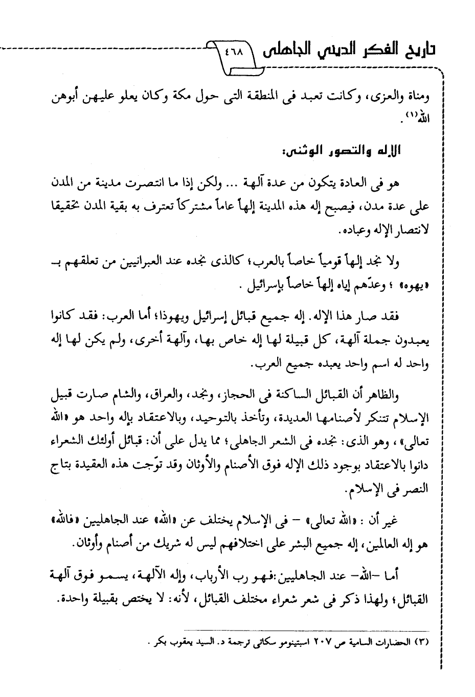 ولا نجد إلهًا قوميًّا خاصًّا بالعرب؛ كالذي نجده عند العبرانيين من تعلقهم بـ "يهوه"؛ وعدهم إياه إلها خاصا بإسرائيل.