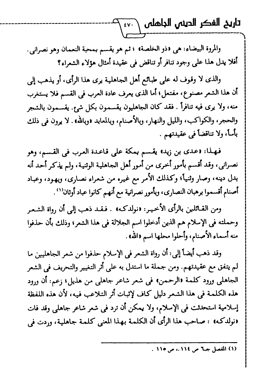 ومن القائلين بالرأي الأخير: "نولدكه"؛ فقد ذهب إلى أن رواة الشعر وحملته في الإسلام هم الذين أدخلوا اسم الجلالة في هذا الشعر؛ وذلك بأن حذفوا منه أسماء الأصنام، وأحلوا محلها اسم "الله".