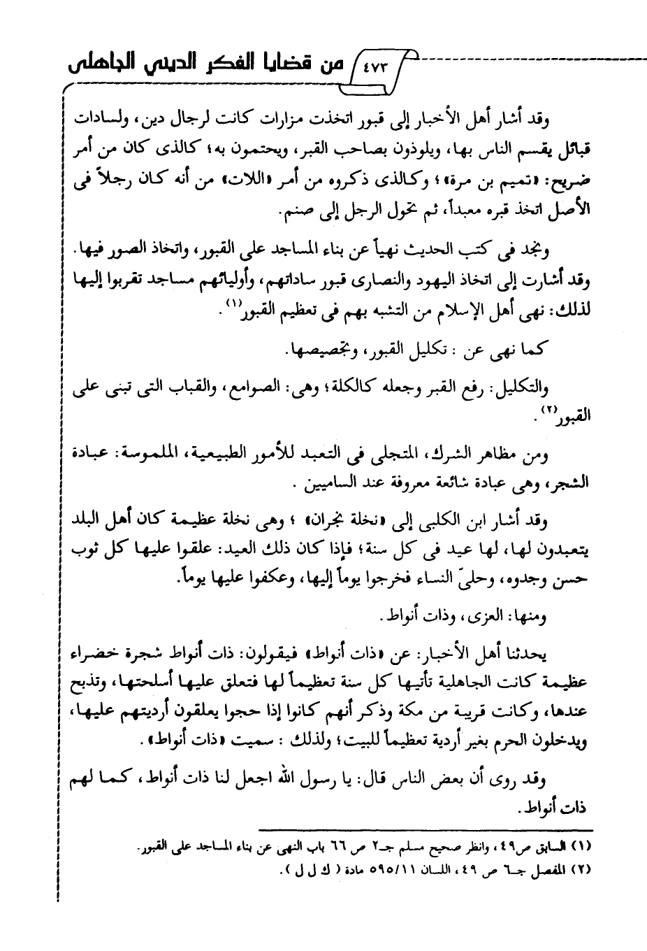 وقد أشار أهل الأخبار إلى قبور اتخذت مزارات كانت لرجال دين، ولسادات قبائل يقسم الناس بها، ويلوذون بصاحب القبر، ويجتمعون به؛ كالذي كان من أمر ضريح: "تميم بن مرة"؛ وكالذي ذكروه من أمر "اللات" من أنه كان رجلا في الأصل اتخذ قبره معبدا، ثم تحول الرجل إلى صنم.