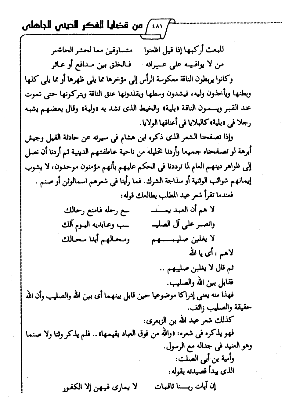 وإذا تصفحنا الشعر الذي ذكره ابن هشام في سيرته عن حادثة الفيل وجيش أبرهة -لو تصفحناه جميعا وأردنا تحليله من ناحية عاطفتهم الدينية، ثم أردنا أن نصل إلى ظواهر دينهم العام لما ترددنا في الحكم عليهم بأنهم مؤمنون موحدون، لا يشوب إيمانهم شوائب الوثنية أو سذاجة الشرك فما رأينا في شعرهم اسما لوثن أو صنم.