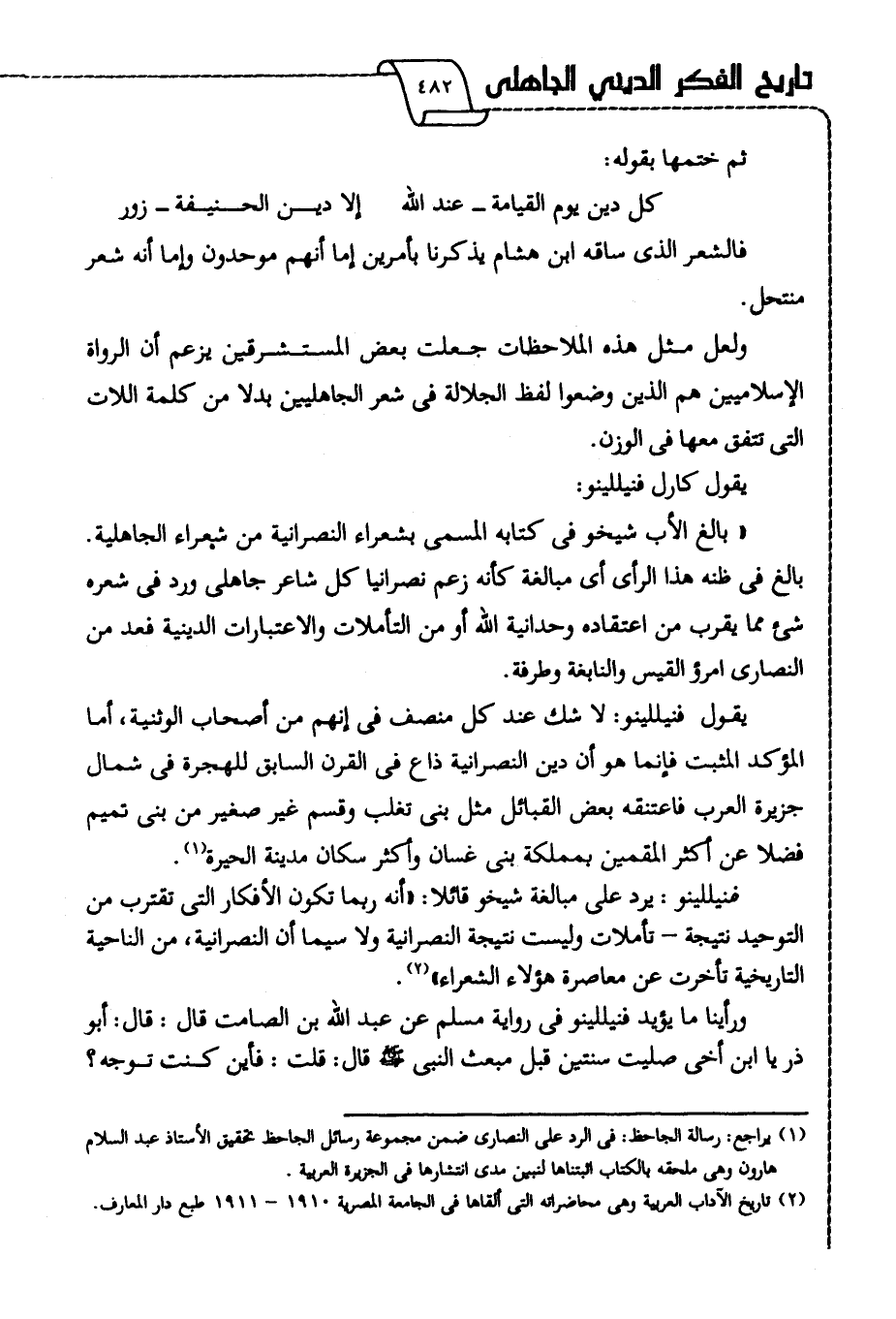 بالغ في ظنه هذا الرأي أي مبالغة كأنه زعم نصرانيا كل شاعر جاهلي ورد في شعره شيء مما يقرب من اعتقاده وحدانية الله أو من التأملات والاعتبارات الدينية فعد من النصارى امرؤ القيس والنابغة وطرفة".