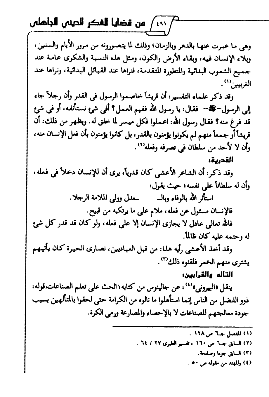 وقد ذكر علماء التفسير: أن قريشا خاصموا الرسول في القدر، وأن رجلا جاء إلى الرسول صلى الله عليه وسلم فقال: يا رسول الله ففيم العمل؟ أفي شيء نستأنف، أو في شيء قد فرغ مه؟ فقال رسول الله: "اعملوا؛ فكل ميسر لما خلق له". ويظهر من ذلك: أن قريشا -أو جمعا منهم- لم يكونوا يؤمنون بالقدر، بل كانوا يؤمنون بأن فعل الإنسان منه، وأن لا لأحد من سلطان في تصرفه وفعله2.